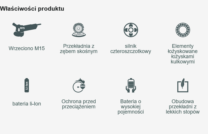 Bateryjna szlifierka kątowa, dwie baterie Li-Ion 3Ah, ładowarka, klucz dwutrzpieniowy do wymiany tarcz, osłona, instrukcja obsługi, karta gwarancyjna, walizka GL-BOXX 136