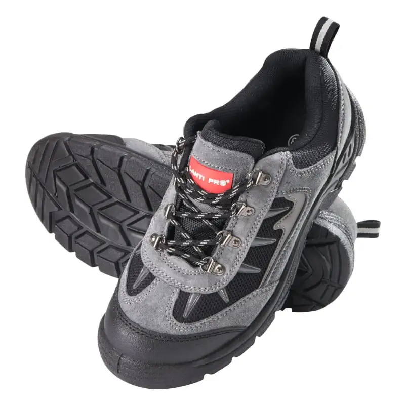 Buty robocze posiadają stalowy podnosek ochronny zabezpieczający palce stopy przed uderzeniem z energią 200J. Podeszwa obuwia posiada odporność na przebicie z siłą 1100N co zabezpiecza stopę przed nadepnięciem np. na wystający gwóźdź. Podeszwa posiada również właściwości antyelektrostatyczne oraz odporność na poślizg na podłożu ceramicznym. Część piętowa absorbuję energię podczas chodzenia. Wierzchnia część ze skóry posiada odporność na olej napędowy. Wierzch buta: skóra zamszowa / dzianina siatkowa. Podszewka: dzianina. Wyściółka: wymienna, formowana anatomicznie. Podeszwa obuwia: poliuretan dwugęstościowy o nowoczesnej linii wzorniczej oraz głęboki protektor zapewniają wysoką stabilność obuwia. Trzewiki robocze posiadają certyfikat CE oraz spełniają normę ISO 20345:2011 Buty robocze są w drugiej kategorii środków ochrony indywidualnej oraz w kategorii bezpieczeństwa S1P SRA