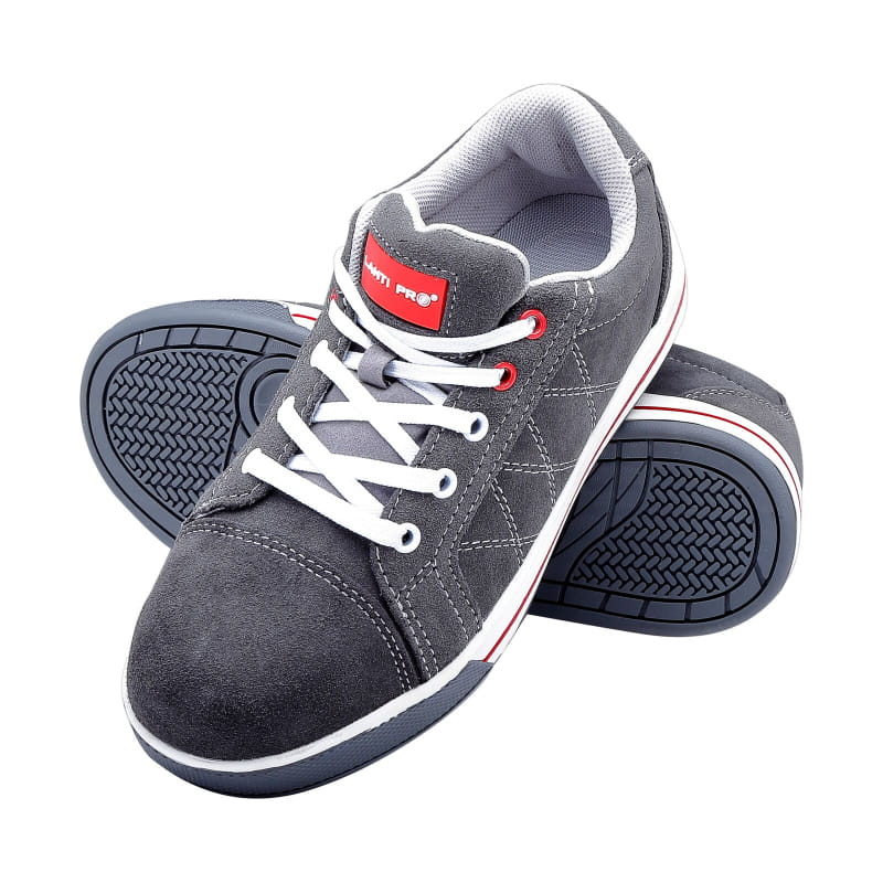 Buty męskie wykonane zostały z trwałej i wytrzymałej na odkształcenia skóry zamszowej w kolorze szarym z elementami w kolorze czerwonym. Podnosek buta jest stalowy i zabezpiecza palce stopy przed uderzeniem z energią 200 J i ściskaniem równym sile 15kN. Środek butów jest wyściełany miłą w dotyku dzianiną. Wyściółka buta jest wymienna. Buty są sznurowane i sięgają przed kostkę. Podeszwa jest wykonana z gumy i znakomicie izoluje stopę od podłoża. Dodatkowo podeszwa odporna jest na poślizg na posadzce ceramicznej oraz odporna jest na olej napędowy. Buty nadaje się przy pracach magazynowych (transport i przeładunek), a także dla mechaników i operatorów maszyn i urządzeń. Buty są lekkie i wygodne oraz zapewniają duży komfort użytkowania. Modny ponadczasowy wzór sprawia, że mogą służyć na co dzień.
