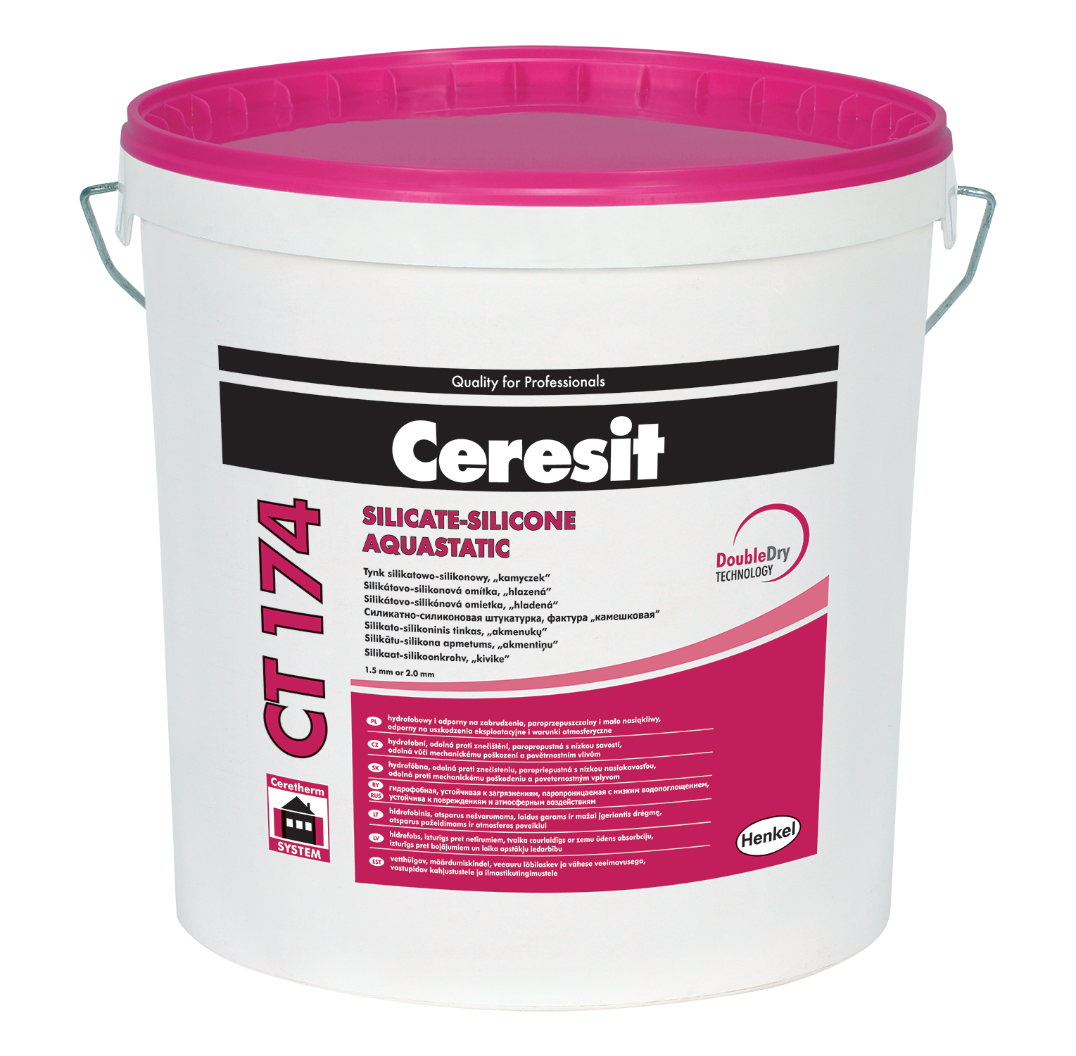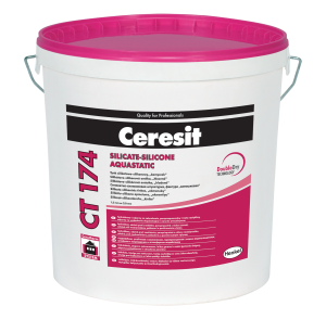Tynk Ceresit CT 174 łączy w sobie zalety tynku silikatowego i silikonowego. Jest paroprzepuszczalny, charakteryzuje się niską nasiąkliwością oraz odpornością na zabrudzenia (Double Dry Technology). Ceresit CT 174 służy do wykonywania cienkowarstwowych wypraw tynkarskich w systemach ociepleń, na podłożach betonowych, tradycyjnych tynkach, podłożach gipsowych oraz na płytach wiórowych, gipsowo-kartonowych itp. Zaleca się stosowanie tynku CT 174 jako wyprawy elewacyjnej w złożonych systemach Ceresit Ceretherm ocieplania ścian zewnętrznych budynków (ETICS) z zastosowaniem płyt styropianowych oraz wełny mineralnej. Tynk CT 174 zalecany jest do stosowania na ścianach zewnętrznych, gdzie wymagana jest wysoka paroprzepuszczalność, niska absorpcja wody oraz wysoka odporność na zabrudzenia (Double Dry Technology). W przypadku intensywnych, ciemnych kolorów stosowanie materiału powinno być ograniczone do niewielkich powierzchni, np. detali architektonicznych. Tynk Ceresit CT 174 posiada formułę BioProtect – zabezpieczenie przed porażeniami biologicznymi, np. grzybami, pleśniami czy algami zwiększające jego odporność na ich oddziaływanie.