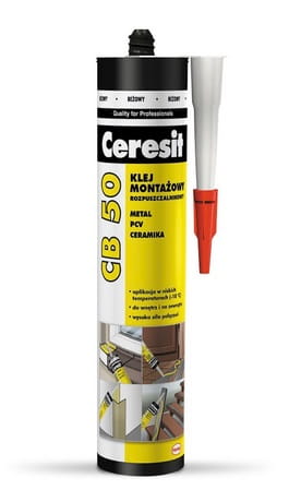 Ceresit CB 50 to profesjonalny klej montażowy o wysokiej sile końcowej połączeń. Ceresit CB 50 jest wodoodporny, można stosować go zarówno do wnętrz jak i na zewnątrz pomieszczeń. Klei nawet w niskich temperaturach (do -10°C). Ceresit CB 50 trwale klei bardzo szeroką gamę materiałów chłonnych i niechłonnych takich jak: cegła, ceramika, beton, metal sklejka, MDF, drewno, kamień, płyty pilśniowe, twarde PCW-U, płyty gipsowo-kartonowe. Nie stosować do PP, PE, PTFE (teflonu), szkła akrylowego jak również do powierzchni na stałe narażonych na działanie wody.
