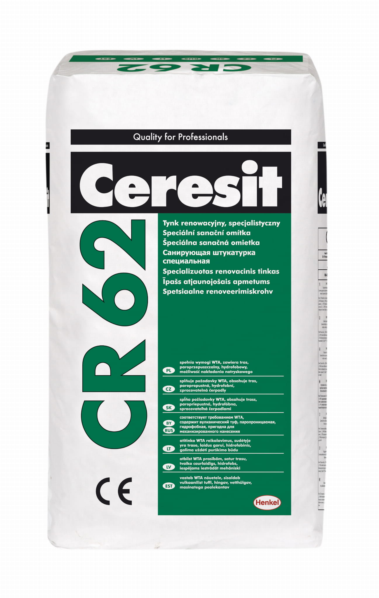 Ceresit CR 62 służy do wykonywania tynków renowacyjnych grubości od 10 do 20 mm. Przeznaczony jest specjalnie do obiektów zabytkowych, do renowacji zawilgoconych i zasolonych murów. Pozwala uzyskać suchą powierzchnię ścian piwnic i fasad. Ceresit CR 62 może być stosowany na dużych powierzchniach oraz do miejscowych napraw. Odpowiedni do podłoży o niewielkiej wytrzymałości o niskim, średnim i wysokim stopniu zasoleniu. Dodatek mączki trasowej zapewnia dobre właściwości robocze oraz ogranicza możliwość powstawania wykwitów solnych. Tynk Ceresit CR 62 z dodatkiem emulsji kontaktowej Ceresit CC 81 może stanowić ażurową