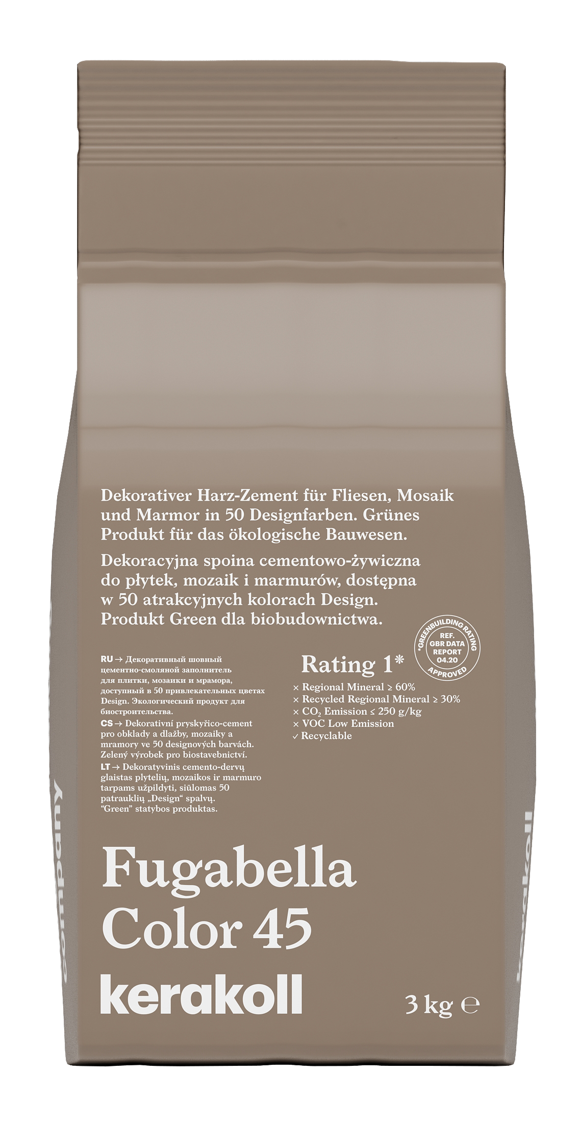 Fugabella® Color jest rewolucyjną, hybrydową spoiną dekoracyjną do wszelkich powierzchni z gresu, mozaik i kamieni naturalnych. Fugabella® Color charakteryzuje się hydrofobowością, niezwykle niską chłonnością wody, wysoką twardością powierzchni, podwyższoną odpornością na najczęściej spotykane substancje kwasowe i całkowitą jednorodnością koloru.