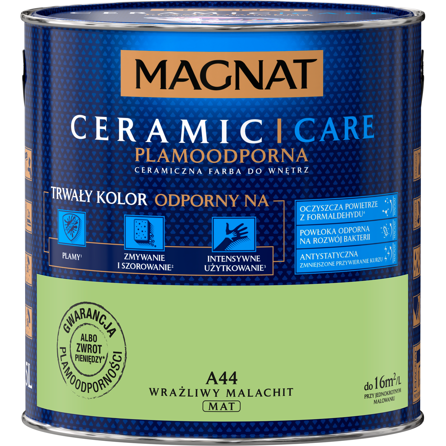 MAGNAT Ceramic Care to wysokiej jakości ceramiczna farba do wnętrz. Doskonałe krycie i intensywne kolory oraz wysokie właściwości użytkowe takie jak odporność na plamy, szorowanie i wielokrotne zmywanie, sprawiają, że świetnie się sprawdzi w każdym pomieszczeniu Twojego domu. Polecana szczególnie do pomieszczeń, w których spędzamy najwięcej czasu (salon, sypialnia, biuro, pokój dziecka), ze względu na swoje ponadprzeciętne cechy – pomalowana powłoka oczyszcza powietrze z formaldehydu, jest antystatyczna (nie przywiera kurzu) oraz odporna na rozwój bakterii. Malowanie farbą MAGNAT jest proste i przyjemne, a efekt pracy trwały i piękny.