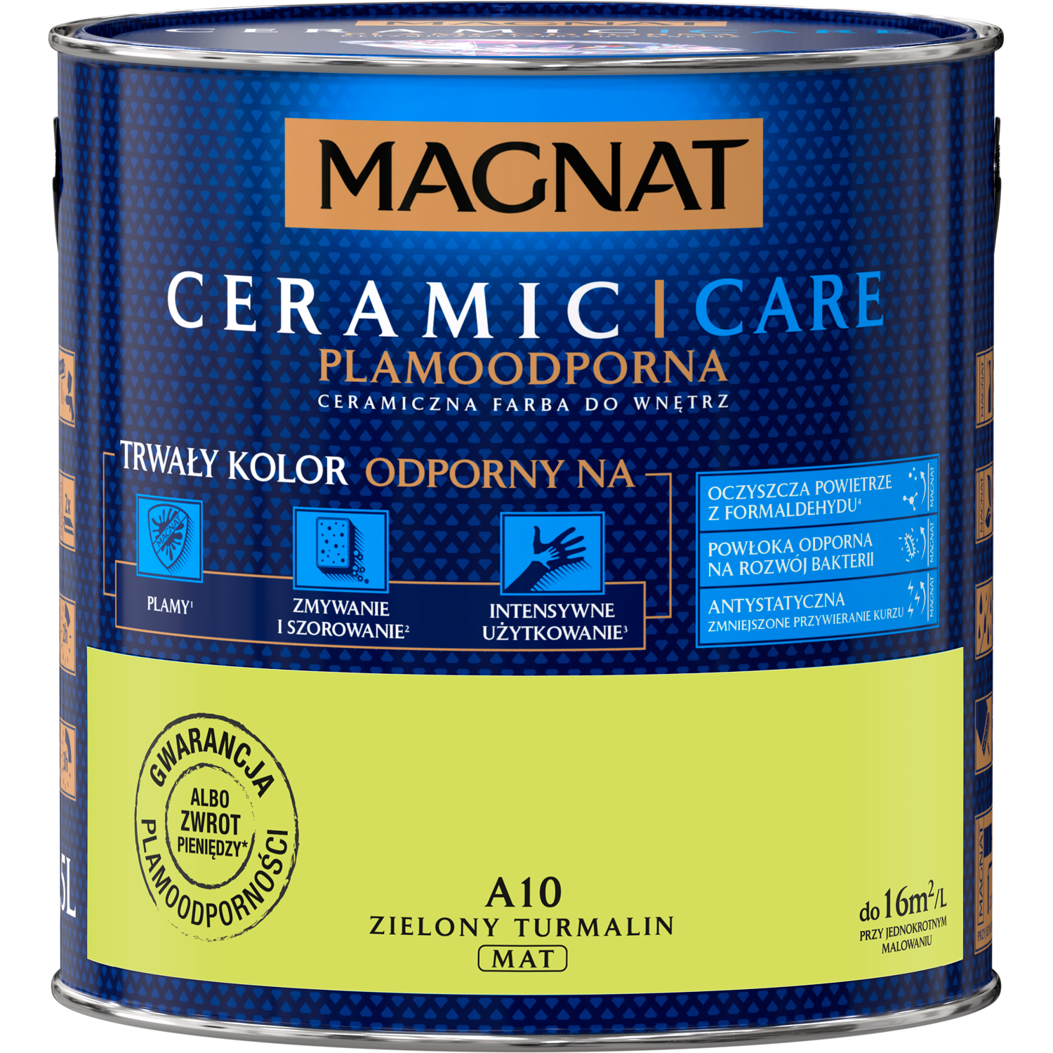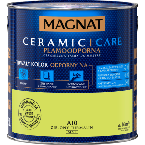 MAGNAT Ceramic Care to wysokiej jakości ceramiczna farba do wnętrz. Doskonałe krycie i intensywne kolory oraz wysokie właściwości użytkowe takie jak odporność na plamy, szorowanie i wielokrotne zmywanie, sprawiają, że świetnie się sprawdzi w każdym pomieszczeniu Twojego domu. Polecana szczególnie do pomieszczeń, w których spędzamy najwięcej czasu (salon, sypialnia, biuro, pokój dziecka), ze względu na swoje ponadprzeciętne cechy – pomalowana powłoka oczyszcza powietrze z formaldehydu, jest antystatyczna (nie przywiera kurzu) oraz odporna na rozwój bakterii. Malowanie farbą MAGNAT jest proste i przyjemne, a efekt pracy trwały i piękny.