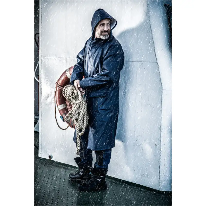 Płaszcz przeciwdeszczowy Lahti Pro model L41702 w kolorze granatowym wykonano z najwyższej jakości materiałów PVC oraz poliestru. Materiały jakich użyto do produkcji płaszczy przeciwdeszczowych są wytrzymałe, lekkie, nie wchłaniają wilgoci i pozwalają wodzie swobodnie spłynąć po ubraniu. Odzież przeciwdeszczowa przydatna jest w ciężkich warunkach pogodowych. Płaszcz Lahti Pro L41702 ma wodoszczelne szwy. Otwory wentylacyjne pod pachami i na plecach zwiększają cyrkulację powietrza. Wodoodporny kaptur z regulacją chowany w kołnierzu zamykanym na suwak. Mankiety płaszcza zakończone wewnętrznym elastycznym ściągaczem chroniącym przed wiatrem i wodą. Płaszcz zapinany jest na zamek błyskawiczny z dodatkową klapką zapinaną na napy. W płaszczu znajdziemy również dwie kieszenie zewnętrzne. Płaszcz przeciwdeszczowy Lahti Pro L41702 jest w pierwszej kategorii środków ochrony indywidualnej, posiada deklarację CE oraz zgodny jest z normą EN ISO 13688.