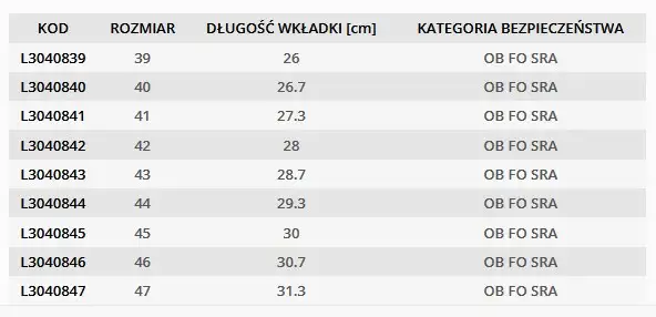 Buty z najnowszej kolekcji LahtiPro. Wierzch obuwia wykonany ze skóry nubukowej oraz dzianiny siatkowej. Podszewka wykonana z dzianiny siatkowej. Wyściółka wymienna. Buty nie posiadają elementów metalowych oraz nie mają podnoska. Podeszwa gumowa o nowoczesnej linii wzorniczej oraz głęboki protektor zapewniają wysoką stabilność obuwia podczas chodzenia. Obuwie posiada certyfikat CE oraz normę ISO 20347:2011. Buty posiadają kategorię bezpieczeństwa OB FO która mówi o tym że obuwie posiada podeszwę odporną na olej napędowy jak również odporność na poślizg na podłożu ceramicznym pokrytym roztworem laurylosiarczanu sodu (SLS).