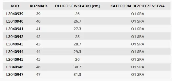 Buty z najnowszej kolekcji LahtiPro. Wierzch obuwia wykonany ze skóry nubukowej oraz dzianiny siatkowej. Podszewka wykonana z dzianiny siatkowej. Wyściółka wymienna. Buty nie posiadają elementów metalowych oraz nie mają podnoska. Podeszwa gumowa o nowoczesnej linii wzorniczej oraz głęboki protektor zapewniają wysoką stabilność obuwia podczas chodzenia. Obuwie posiada certyfikat CE oraz normę ISO 20347:2011. Buty posiadają kategorię bezpieczeństwa O1 SRA która mówi o tym że obuwie posiada zabudowaną pięte, właściwości antyelektro-statyczne oraz absorpcje energii w części piętowej jak również odporność na poślizg na podłożu ceramicznym pokrytym roztworem laurylosiarczanu sodu (SLS).