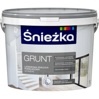 Śnieżka Grunt dzięki specjalnym dodatkom nakłada się grubą warstwą i niweluje różnice w fakturze i barwie podłoża. Wnika w podłoże poprawiając przyczepność warstwy farby nawierzchniowej oraz zmniejsza jej zużycie. Stosowanie Śnieżki Grunt znacznie obniża koszt malowania gdyż do uzyskania oczekiwanego efektu zwykle wystarcza jedna warstwa farby podkładowej i jedna nawierzchniowej. Szczególnie polecana jest do pierwszego malowania płyt gipsowo-kartonowych i podłoży o niejednorodnej fakturze. Doskonale kryje zaprawy cementowe, cementowo-wapienne, drewno i materiały drewnopochodne w pomieszczeniach mieszkalnych, użyteczności publicznej i przemysłowych. Przeznaczona jest do wymalowań wewnątrz pomieszczeń.