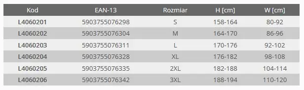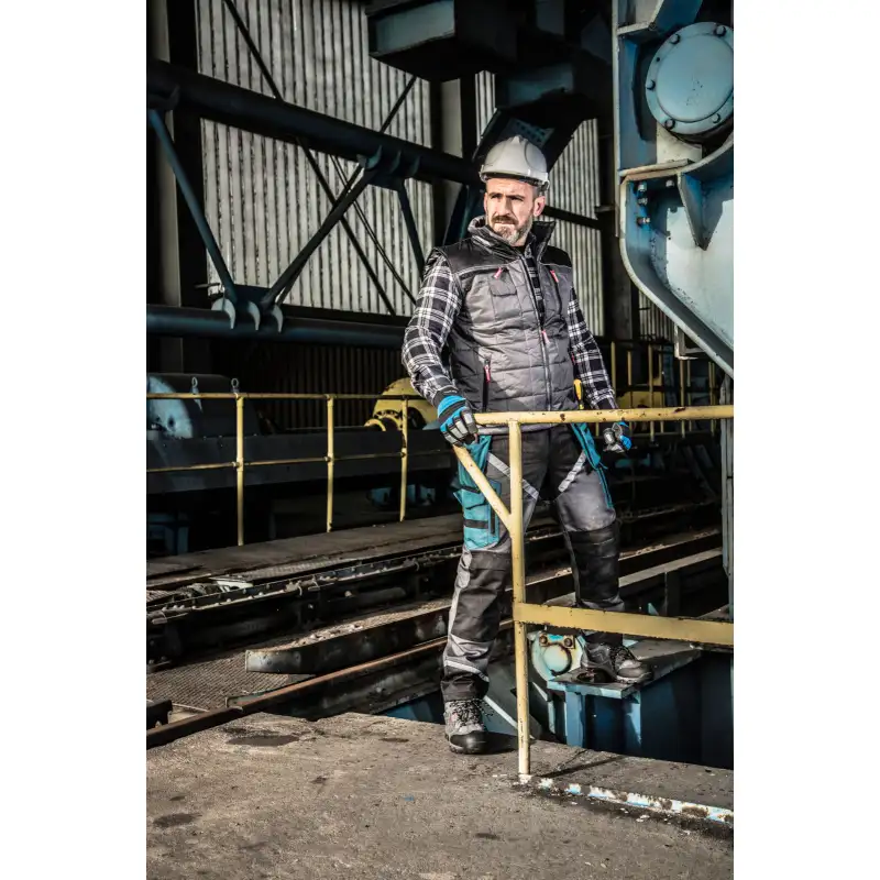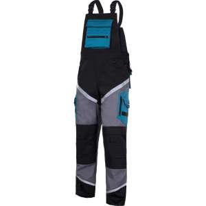 Spodnie z najnowszej kolekcji marki Lahti Pro. Ogrodniczki wykonano z materiału o gramaturze 270g/m2 (35% bawełny, 65% poliester) w kolorze czarno-szaro-turkusowym z pasami odblaskowymi poprawiającymi widoczność pracownika podczas pracy. Spodnie posiadają 18 kieszeni w tym 3 zamykane na suwak, kieszeń na telefon komórkowy. Otwory wentylacyjne w kroku zwiększają cyrkulację powietrza. Potrójne szwy oraz dodatkowe wzmocnienia szwów w kroku. Regulacja szerokości w pasie za pomocą guzików i gumki. Specjalna konstrukcja klamry zapobiegająca jej zsuwaniu się. Dodatkowo ogrodniczki posiadają oczko na klucze, dwie szlufki na młotek oraz dwa uchwyty na miarkę. Możliwość dokupienia ochraniaczy kolan model LPN001. Wszywka identyfikacyjna. Spodnie są w pierwszej kategorii środków ochrony indywidualnej. Posiadają certyfikat CE oraz normę EN ISO 13688.