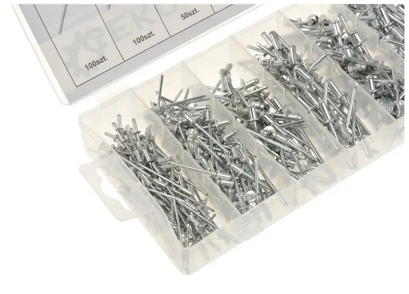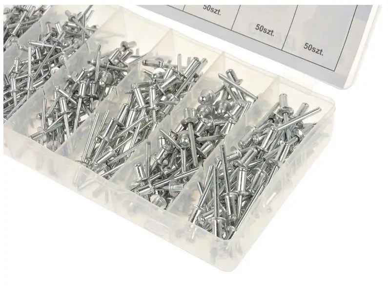 Zestaw nitów zrywalnych. Kołnierz nitu wykonano z aluminium, natomiast trzpień ze stali nierdzewnej. W zestawie 400 sztuk w popularnych rozmiarach.