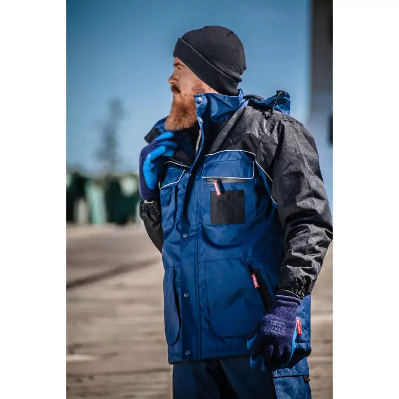 Odzież firmową wykonano z bardzo mocnego materiału o gramaturze 200g/m2. Ciuchy robocze BHP z serii Lahti Pro uszyte z wytrzymałej impregnowanej tkaniny pokrytej PU. Taka tkanina idealnie zabezpiecza przed zimnem i wiatrem. Kurtka posiada ocieplany kaptur z regulacją, mocowany na suwak. Kurtka posiada 10 kieszeni, 9 zewnętrznych w tym 3 zapinane na wodoszczelny suwak oraz 1 wewnętrzna. Dodatkowa kieszonka na telefon komórkowy. Wodoszczelne suwaki zwiększające ochronę przed deszczem. Bardzo mocny zamek błyskawiczny z dodatkową klapką na napy